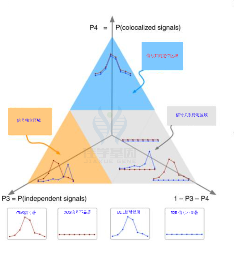 上图显示佳学基因肺癌转移风险基因鉴定的人工智能算法示意图,该算法采用S-PrediXcan基因型肺癌转移能力的共定位状态。采用三元图显示,表示COLOC中各种配置的概率。该图方便地约束了这些值,使得概率之和为1。水平线上的所有点具有相同的“共定位”GWAS和eQTL信号(P4)概率,平行于三角形右侧(NW至SE)线上的点具有相同的“独立信号”(P3)概率,平行于三角形左侧(NE至SW)的线对应于常数P0+P1+P2。蓝色的顶部子三角形对应于高共定位概率(P4 > 0.5),左下角橙色子三角形对应独立信号的概率(P3 > 0.5),右下角平行四边形对应的基因没有足够的能力明确或者是否定共定位关系。其他图形显示部分显示了COLOC概率的三元图,并将S-PrediXcan高度表型结果与密度表型结果进行叠加。