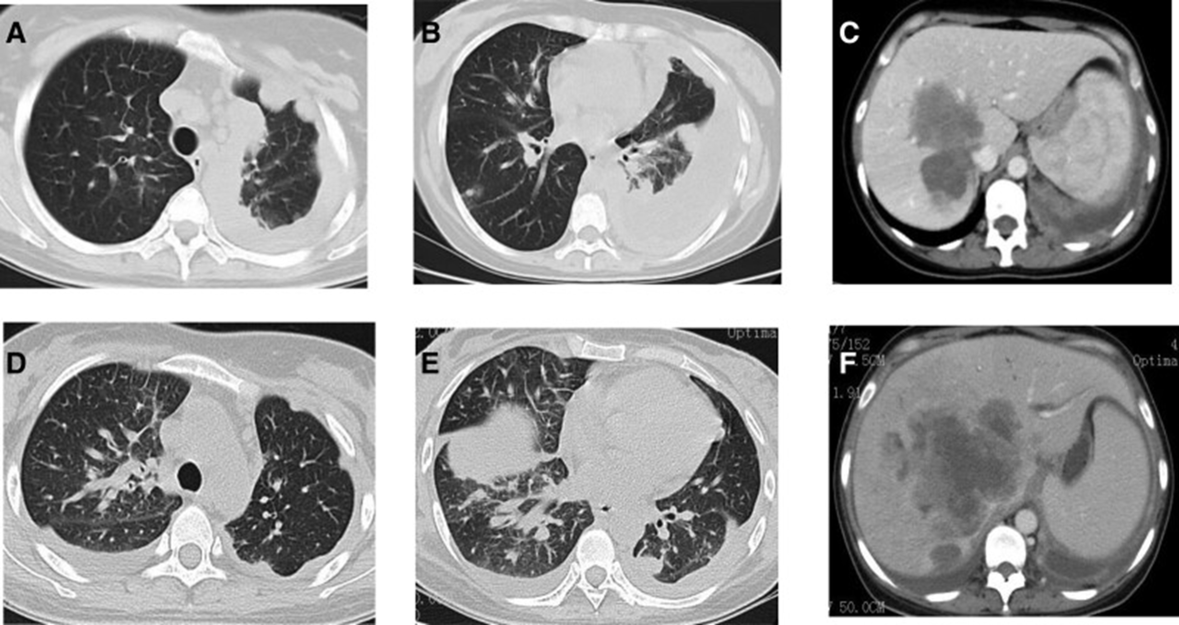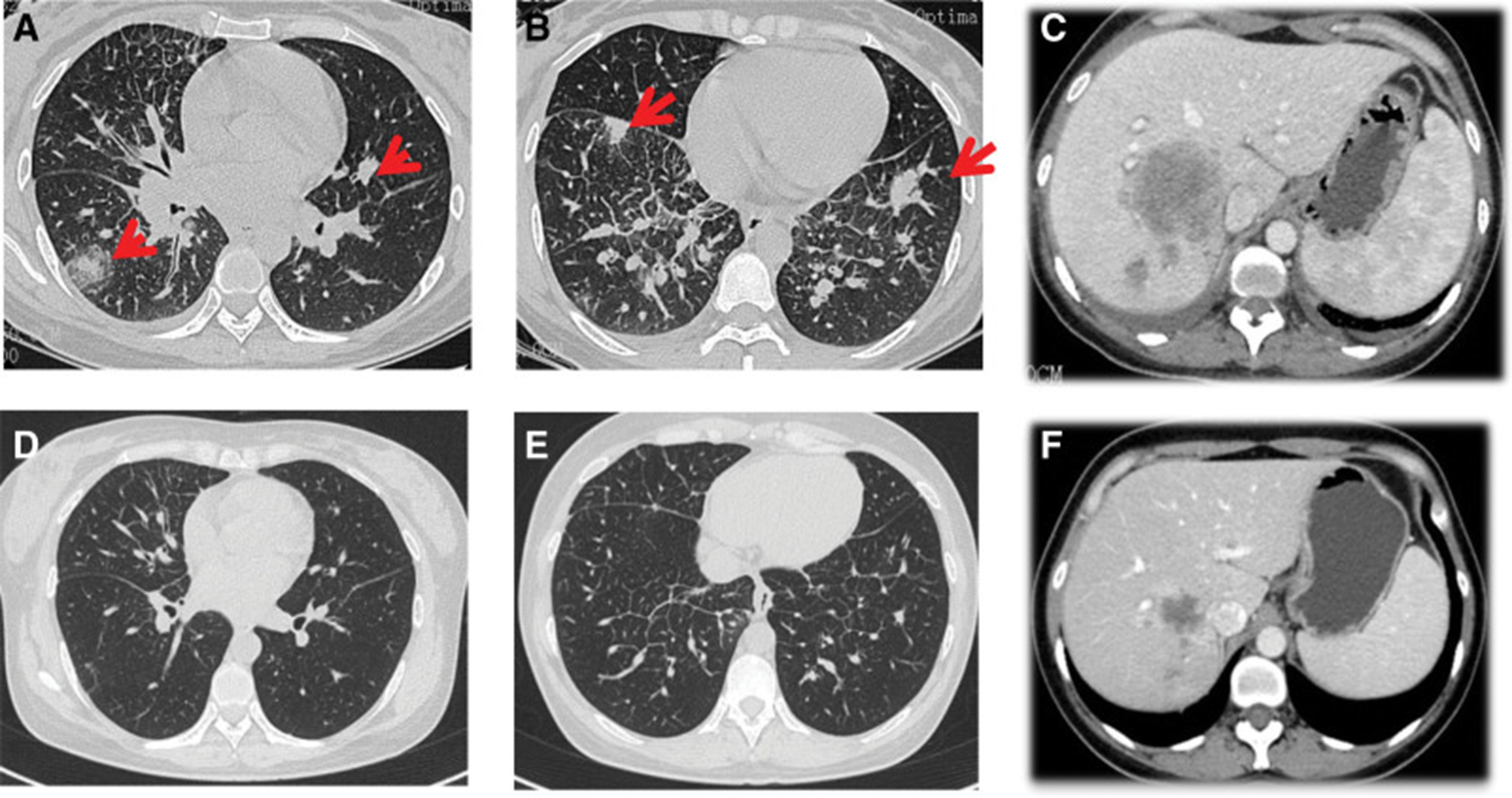 1个月后复查显示肺部和肝内病变进展(图1)。(图 6A-C)(根据RECIST1.1),她的抗肿瘤治疗改为“培姆曲塞加卡铂和贝伐单抗”的治疗一个周期。2020年12月至2021年1月,再次改变患者的治疗方案,这次改为“劳拉替尼联合达拉非尼”靶向治疗。使用 PD 联合胸部和腹部 CT 评估疗效(图 1)。(图 6D-F)(根据 RECIST1.1)。患者无法耐受化疗、靶向治疗、IO 治疗或任何其他积极的抗肿瘤治疗。这是因为患者的一般情况较差,包括发烧、腹痛和胆红素水平升高等症状。随后,给予患者静脉营养、镇痛等对症支持治疗。患者于 2021 年 2 月 4 日去世,总生存期(OS)为 10 个月。