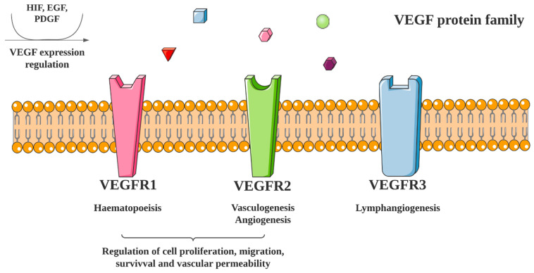 VEGF 家族包含多种多肽生长因子,主要成员有 VEGF-A、-B、-C、-D 和 -E。其中,VEGF-A 在成熟机体的血管发育过程中扮演着核心调控角色。VEGF 通过与其受体结合发挥作用,这些受体包括 VEGFR-1、-2 和 -3 三种亚型(如图1所示,VEGF 受体参与细胞生长过程)。VEGF 与受体结合后,会促进受体形成同源或异源二聚体,继而激活下游信号传导通路。