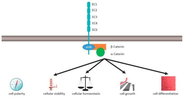 E-钙粘蛋白是信号通路的关键部分,如细胞周期蛋白激酶抑制剂 p27 介导的信号传导、丝裂原活化激酶 (MAPK) 的激活、大鼠肉瘤病毒癌基因 (Ras) 和 ras 相关的 C3 肉毒杆菌毒素底物 (Rac1) 信号传导、磷脂酰肌醇-3-激酶 (PI3K)/AKT 信号传导、HIPPO 信号传导和上皮间质转化 。