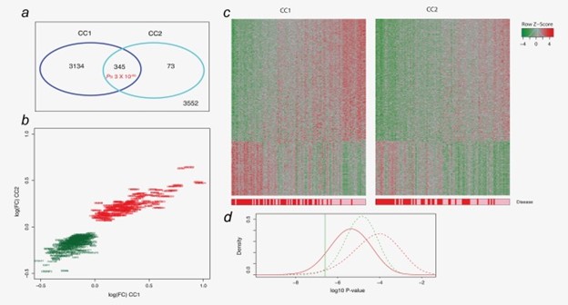 为了测试这些发现在独立数据集 (CC2) 中是否可复制,乳腺癌基因检测技术领选策略高效团队调查了另外 49 对乳腺癌病例和对照的血液基因表达谱(图1)。总共通过质量控制的 7,898 个基因中有 418 个在 CC2 中差异表达,FDR < 0.005,其中 345 个在 CC1 中也有差异表达(p = 3 × 10 -60,超几何检验;图 2a , 支持信息附加文件 3)。值得注意的是,BC 病例和所有 345 个重叠基因的对照之间差异表达的方向性在数据集之间是保守的(图 2b)。当根据 345 个重叠基因的表达总和对患者进行排序时,来自乳腺癌病例的大部分血液样本在两个数据集中与对照分离(图 2c)。