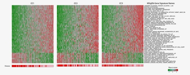 图 3:根据乳腺癌病例(红色)和对照(粉红色)在初级 (CC1)、二级 (CC2) 和验证 (CC3) 病例对照中差异表达的 45 个显着基因集的富集评分对血液样本进行排序系列。热图颜色代表对数空间中以平均为中心的折叠变化富集分数。