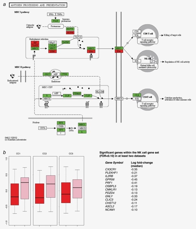 图 4:抗原加工和呈递途径 (APP) 和自然杀伤 (NK) 细胞基因集的基因集变异分析。( a ) 来自 KEGG 的 APP。驱动所观察到的 APP 与 CC1 和 CC2 中存在的乳腺癌关联的重叠核心基因根据它们在乳腺癌患者中的过度(红色)或不足(绿色)表达而着色。(乙) 箱线图表示来自 NK 细胞基因集的基因集变异分析的富集分数,该基因集与来自 CC1、CC2 和 CC3(左)中的乳腺癌患者(红色)和对照(粉红色)的基因表达谱相关。NK 基因集中包含的基因列表与配对线性分析中的疾病状态显着相关,三个数据集中的至少两个数据集中的 FDR < 0.10 及其在所有数据集中的相应中值倍数变化(右)。