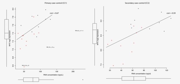 图 5:根据 MYC 的表达,前五分之一血液样本的 RNA 浓度对乳腺癌患者(红色)和对照(黑色)之间MYC基因组的差异富集贡献贼大。对主要 (CC1) 和次要 (CC2) 病例对照系列中的每个线性回归线给出了 Spearman 相关性 (corr)。