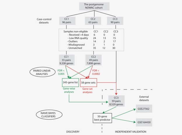 图1:课题研究流程图。显示了来自挪威妇女和癌症 (NOWAC) 研究 (CC1、CC2 和 CC3) 的三个独立病例对照数据集的样本排除。进行配对线性分析以鉴定单个基因(错误发现率,FDR < 0.005)和基因组(FDR < 0.002)在乳腺癌病例对照对中差异表达。使用朴素贝叶斯分类器基于在 CC1 和 CC2 中差异表达的 345 个基因的表达预测 CC3 中乳腺癌的存在。在 345 个基因列表中进一步选择了 50 个基因,并在来自 NCBI 基因表达综合数据库的两个外部数据集中进行验证(包括来自乳腺癌患者、良性乳腺疾病患者、对照、胃肠道和大脑的外周血单个核细胞 (PBMC) 的基因表达谱)癌症患者 ( GSE27562 ) 和来自乳腺癌患者和对照组的外周血细胞的基因表达谱以及疑似乳房 X 线照片 ( GSE164430 )。[颜色图可以在在线问题中查看,该问题可在wileyonlinelibrary.com 获得。]