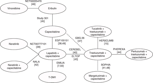 进行了符合PRISMA标准的SLR,以确定具有可用有效性和安全性结果的所有相关临床试验。在EMBASE、PubMed和Cochrane图书馆进行了搜索(2020年11月23日),包括人群、干预措施和研究类型的术语。还对灰色文献和临床试验登记进行了搜索。研究结果由两名研究人员独立筛选。SLR包括接受HER2+转移性乳腺癌(MBC)治疗的患者的随机对照试验,这些患者在≥1次既往HER2定向治疗(或化疗,用于在包括HER2+亚组的转移性乳腺癌(MBC)患者混合人群中评估艾日布林的试验)报告了疗效或安全性数据。