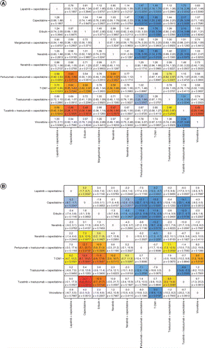 (A)无进展生存风险比。(B)基于分数多项式网络荟萃分析(带锚定)的平均无进展生存期的差异。