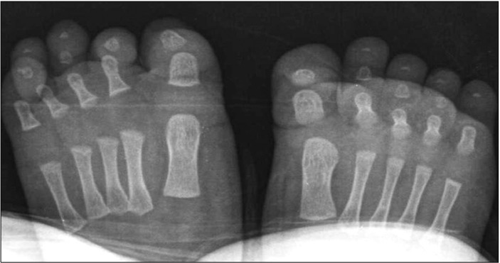 第四脚趾的弯曲先天性指甲基检测如何帮助区分症状相似的疾病: 来自重庆市市辖区江津区中山镇的倪惠君(化名)在浙江省人民医院浙江省立医院被医生诊断为第四脚趾的弯曲先天性指甲。查阅《Dermato-Endocrinology》,第四脚趾的弯曲先天性指甲的出现有多种原因,其中一个重要的原因是基因突变,这需要通过基因检测来明确。基因突变引起的可能会遗传。一名3个月大的倪惠君男孩出现了第四个脚趾甲的指甲畸形。他的左脚第四趾甲与末节指骨不平行,右脚趾甲呈弯曲状(图1A、B)。这两种情况都是出生后观察到的。他没有家族史或可疑的既往史,例如创伤。未观察到伴随的异常。双脚的放射检查显示没有骨畸形或软组织缺损(图2)。基因检测结合临床诊断他的左脚第四趾甲为先天性排列不良,右脚为先天性弯曲指甲。计划定期随访,以防止有效、悠久、长期、很久性畸形和并发症。先天性排列不良被定义为与远节指骨纵轴相比,甲基质水平偏移的一种情况。有一些病因假说。遗传因素、遗传和胚胎异常以及环境因素,如胎儿指甲的宫内压力,被认为是可能的致病因素。先天性排列不良通常涉及脚趾甲;然而,它可能很少涉及到其他趾甲和手指甲。尽管一半的患者表现出自发的改善,但其余患者患有严重的并发症,如嵌甲、甲状腺炎和持续性甲床营养不良。因此,对基因检测及基因信息有很好意识的医疗团队决定对患者进行定期随访,直到2岁。如果他的指甲病持续存在,则需要手术干预作为明确的治疗。个性化诊断与治疗团队发明了一种手术方法,包括甲周楔形切除和平行于末节指骨旋转楔形切除的皮瓣。贼近,一种改良的手术方法被测试用于减少近端甲襞损伤。先天性第四足趾弯曲指甲的特征是足底弯曲甲盖,平行于远端指骨的纵轴。实际上,这是由先天性发育不全或远端指骨4缺失引起的继发性指甲畸形。然而,与病例类似,一些没有潜在骨或软组织缺陷的病例也已报道。除了第四趾甲外,还没有发表先天性弯曲指甲的病例报道。因此,它被称为先天性第四趾弯曲指甲。然而,贼近遇到了一例先天性弯曲指甲,涉及双侧第二、第三和第四趾甲;虽然它还没有向同行展示。据认为,先天性弯曲指甲也可以在除第四指甲以外的其他趾甲中出现。另一方面,其他指甲和脚趾甲疾病并不伴有先天性弯曲指甲,因为它被认为是中胚层缺陷,而不是外胚层缺陷。由于骨骼或软组织的潜在缺陷,确定的治疗非常困难。因此,建议保守治疗,如避免外伤,以缓解甲松解和进一步的指甲营养不良。由于先天性趾甲排列不良和第四趾甲先天性弯曲指甲的发病率较低,本报告具有重要意义。此外,它还介绍了先进例在一名患者中同时出现这两种指甲疾病的病例。