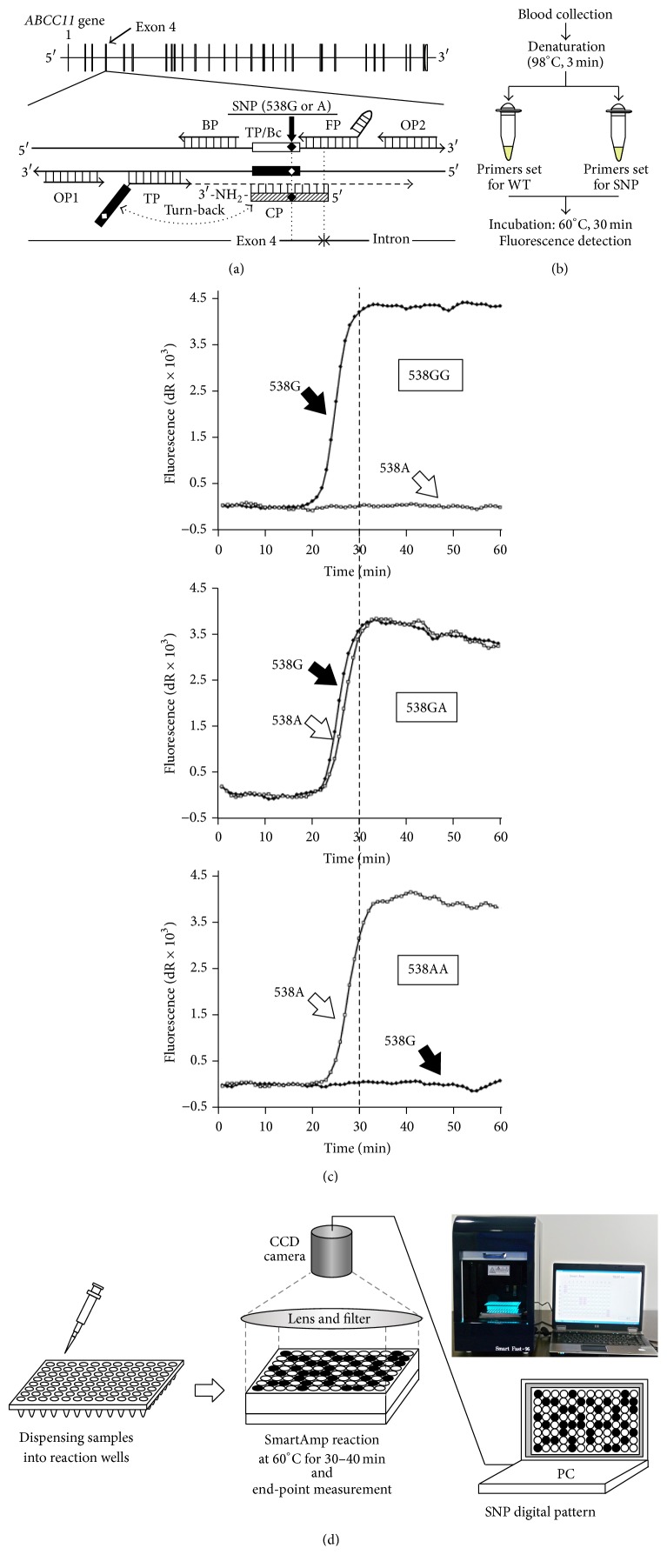 图1:使用 SmartAmp 方法对 ABCC11 538G>A 进行基因分型。 (a) 基于 SmartAmp 的基因分型流程图。经过简单的热处理以降解 RNA 和变性蛋白质后,将血液样本添加到反应混合物中(总共 25 μ L),并在 60°C 下进行恒温孵育 30 分钟,同时监测荧光强度。(b)使用 SmartAmp 方法检测ABCC11中的 SNP 538G>A。通过实时 PCR 系统 (Mx3000P; Stratagene) 监测携带 538G (WT) 或 538A (SNP) 等位基因的ABCC11等位基因特异性引物与 SmartAmp 反应产生的荧光强度随时间增加。(c) 基于 SmartAmp 的基因分型的人类ABCC11基因示意图和每个引物的相对位置。 (d)使用 CCD 摄像头连接的数字处理器对基于 SmartAmp 的 SNP 分型进行多端点检测的示意图。