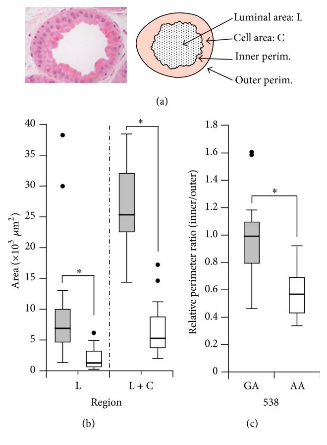图 4:ABCC11 538GA 和 538AA 的人类顶泌腺图像分析。(a)外耳道中人类顶泌腺的典型图像(左)。图像分析测量参数示意图(右)。(b 和 c)ABCC11 538GA 受试者的顶泌腺发育良好(灰色),而 538AA 受试者的顶泌腺发育良好(白色)。使用 ImageJ 程序 (v1.46d) 分析了人类顶泌腺 的组织学图像。计算数据以箱线图表示。当p < 0.01 ( ∗ )时,差异被认为是显着的。
