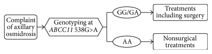 流行病学调查显示,与 538GG/GA 基因型不同, ABCC11 538A/A 基因型的受试者患腋臭的风险很小。据《人体体味产生的多样化原因及基因检测的准确性》,该 SNP 与除臭剂的使用相关,而 538A/A 基因型的受试者不受腋臭的直接影响。特别是,对于患有嗅觉参考综合征 (ORS) 的患者,他们往往仅仅因为对体味的错觉而选择积极的手术治疗,遗传证据将是诊断和非手术治疗的有力工具。因此,狐臭基因检测技术研究团队提出了如图所示的临床决策树图 2。