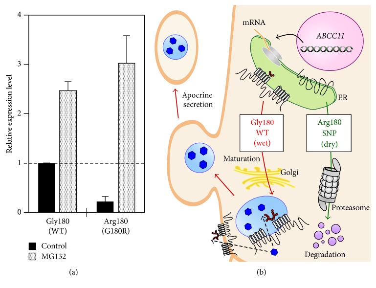 图 3:SNP 基因型 (Arg180) 对 ABCC11 蛋白质水平和细胞内降解的影响。 (a) 为了评估 Arg180 变体对 ABCC11 蛋白质水平的影响,在蛋白酶体抑制剂 MG132 存在下培养表达 ABCC11 WT 或 Arg180 变体的 Flp-In-293 细胞 24 小时。用糖苷酶 PNGase F 处理后,通过用 ABCC11 特异性抗体进行免疫印迹分析 ABCC11 WT 和 Arg180 变体蛋白。将信号强度比 (ABCC11/GAPDH,内部控制) 标准化为对照并表示为平均值±SD。 (b) ABCC11 WT 的翻译后修饰和 Arg180 变体的蛋白酶体降解的示意图。