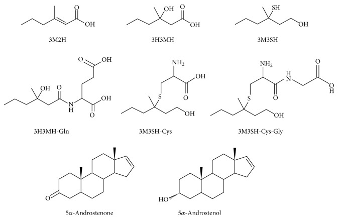 腋臭的主要成分是不饱和脂肪酸、羟基化支链脂肪酸、硫烷基烷醇和一些类固醇,代表分别为 (E)-3-甲基-2-己烯酸 (3M2H) 、3-羟基-3-甲基己酸 (3H3MH)、3-甲基-3-硫烷基己烷-1-醇 (3M3SH) 、5 α -雄烯酮和 5 α -雄甾-16-烯-3 α -醇(图 6)。此外,体外转运实验表明,3M3SH 的假定前体 3M3SH 的谷胱甘肽结合物可通过 ABCC11 WT 转运,提示 ABCC11 参与了腋臭的形成。已发现这些气味成分的一些前体是由腋窝顶泌腺分泌的,这表明抑制腋窝顶泌腺的分泌和/或发育有助于预防或治疗腋臭。