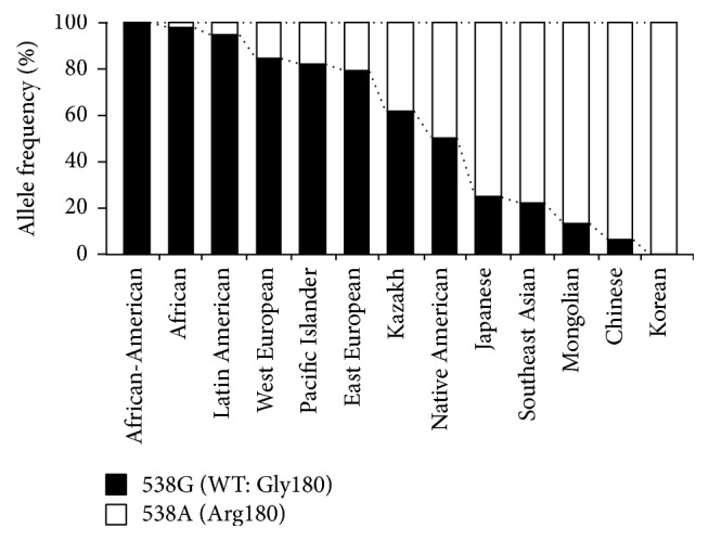 图 5:不同种族人群中ABCC11 538G (WT; Gly180) 和 538A (Arg180)的等位基因频率