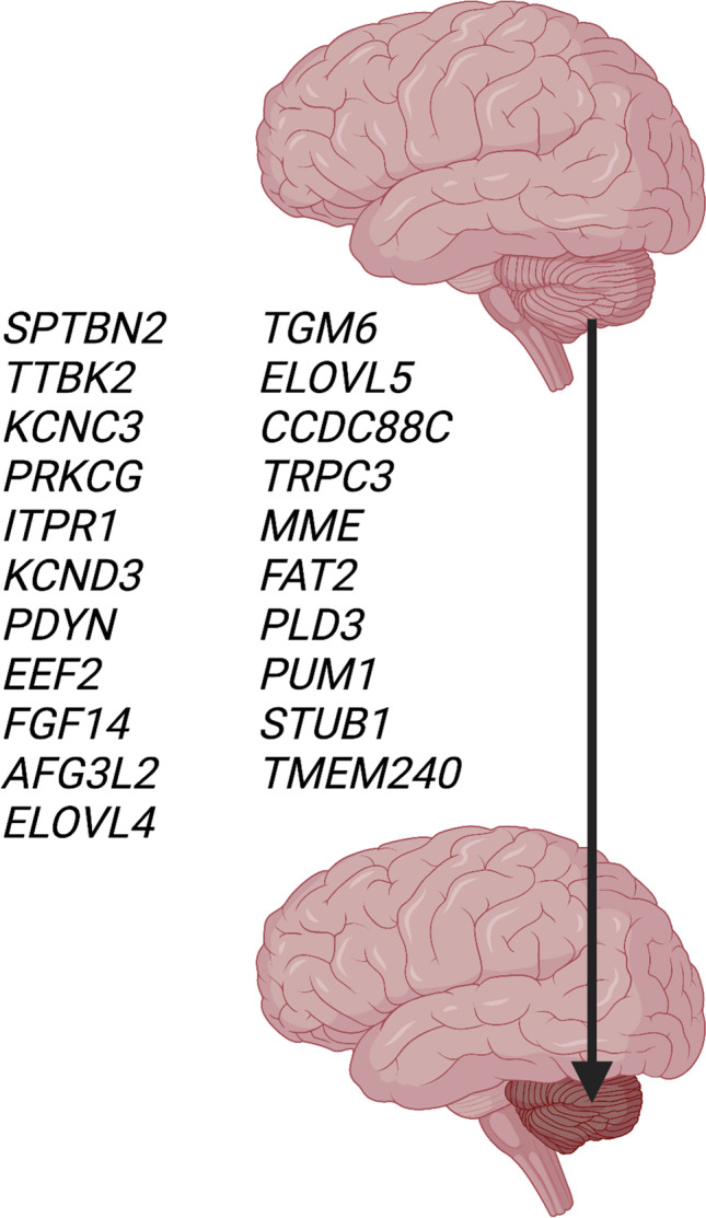 KCNC3编码钾电压门控通道亚家族 C 成员 3 (Kv3.3)。电压门控钾通道在大脑快速放电神经元的快速复极化中起重要作用。Kv3.3 与肌动蛋白结合并稳定皮质肌动蛋白网络。KCNC3 突变会干扰神经元肌动蛋白网络的调节,从而干扰动作电位持续时间和频率的正常调节。这反过来会干扰电压门控 Ca 2+通道和 Ca 2+稳态的重组和功能,而这是浦肯野细胞生存和正常运作所必需的,即它们在运动功能中的作用。