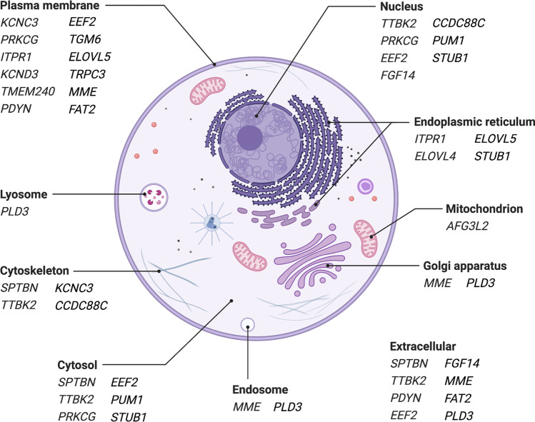 图 3:脊髓小脑变性相关基因编码的多肽的亚细胞定位。请注意,一种基因产物可以存在于多个细胞区室中。仅给出置信度最高的位置(基因卡的 4、5 级)
