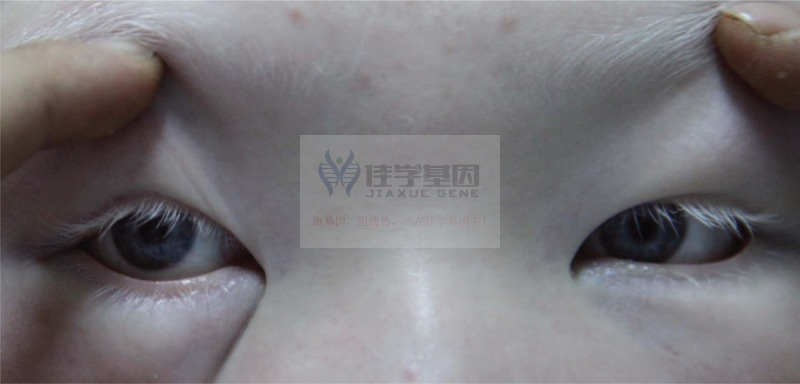 基因检测前的临床检查:检查显示皮肤非常白皙,金色头发和眉毛,深棕色睫毛和虹膜,双侧有 KF 环。KF 环 = Kayser Fleischer 环。