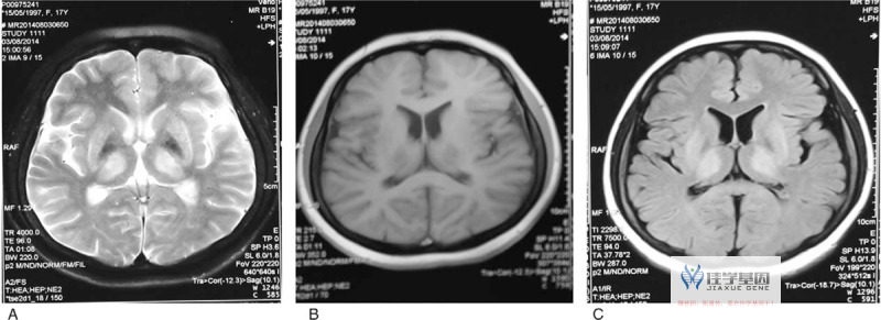 MRI 图像显示 T2 加权图像 (A) T1 加权图像 (B) FLAIR 图像 (C) 中涉及基底神经节、丘脑和脑桥的双侧对称高强度信号。FLAIR = 液体衰减反转恢复,MRI = 磁共振成像。
