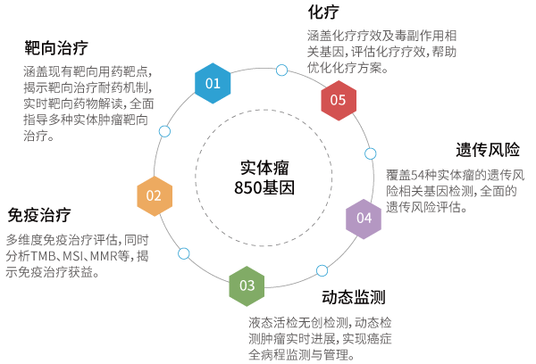 一次性检测实体肿瘤850个基因的全部外显子区域,全面覆盖药物靶点基因,为患者靶向和化疗药物匹配或参加临床试验提供更多机会。