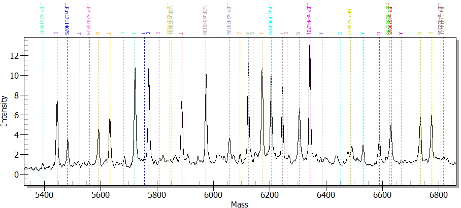 分型结果示例。以下是MassARRAYSNP基因分型飞行质谱分析图: