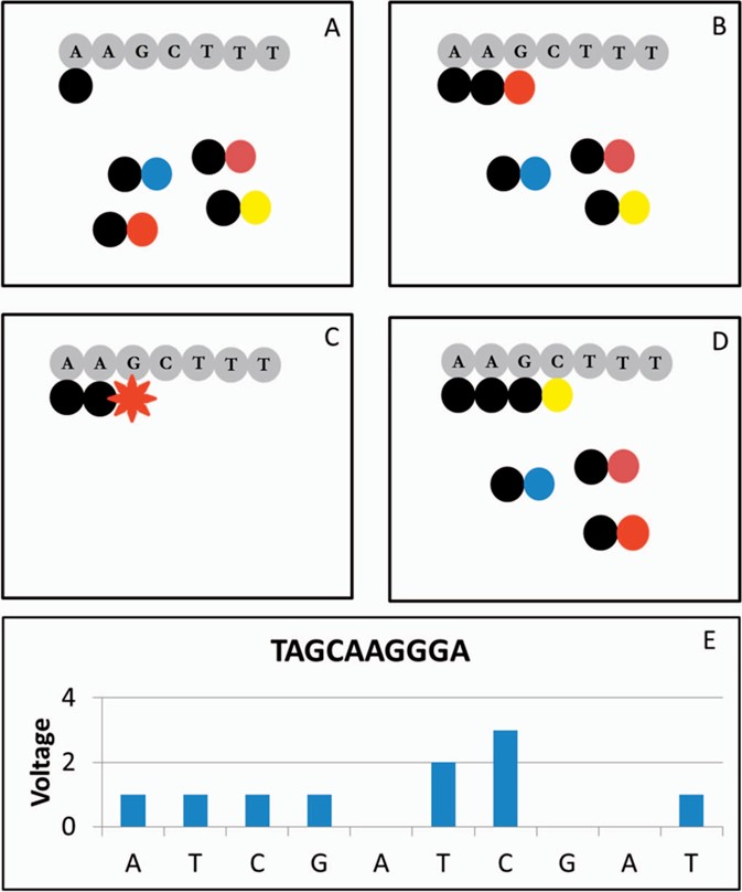 图 3:Illumina 边合成边测序(A 到 D)和 Ion Torrent 离子测序(E)的图示。A,荧光标记的核苷酸(黑色圆圈和彩色圆圈)竞争 DNA 链上的下一个互补空间(灰色圆圈)。B,当掺入荧光标记的核苷酸时,它会阻止核苷酸的进一步添加。C,清洗流通池,去除额外的荧光标记核苷酸,激光信号导致荧光发射。D,荧光标签和阻断剂被去除并洗掉,允许在下一个循环中掺入下一个碱基。这同时发生在簇中的所有 DNA 链和流动槽上的所有簇中。E,在每个循环中,以一组模式添加一个碱基。对于此示例,碱基添加的顺序是 A、T、C 和 G,然后重复。如果加入碱基,则会释放离子,从而导致与连续添加的碱基数量成正比的 pH(电压)变化。