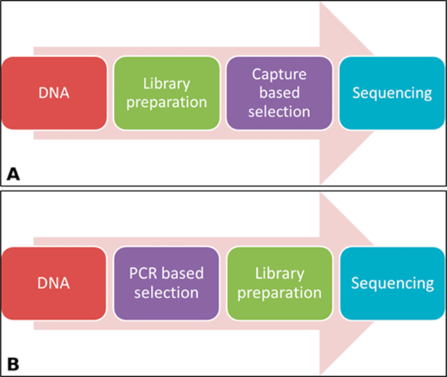 图1:A,基于捕获的测序的实验室操作步骤概述。DNA 进行文库制备,然后在测序前进行基于捕获的选择。B,基于聚合酶链反应 (PCR) 的测序的湿式工作台步骤概述。PCR 选择步骤发生在文库制备之前,或者可以与基于 PCR 的测序中的文库制备步骤结合使用。