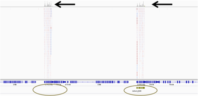 图 5:右侧显示CYP21A2基因和设计用于序列捕获的诱饵(表 2 )(绿色条)。左侧显示没有诱饵的CYP21A2假基因。与真实基因相似的测序读数被映射到假基因;由于读数非常相似,因此无法确定实际来源。这些读数的映射质量得分较低,因为读数映射到超过 1 个位置,如褪色所示。黑色箭头:覆盖范围(灰色峰),绿色圆圈:诱饵位置(如果有)。裁剪的集成基因组查看器 (IGV) 屏幕截图(Broad Institute,Cambridge,Massachusetts)。