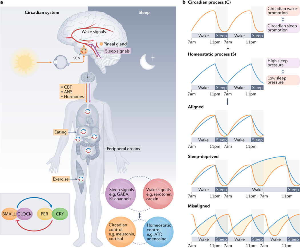 尽管 Alexander Borbely 及其同事在 20 世纪 80 年代初开发了睡眠的工具性双过程模型,正式确立了昼夜节律系统对睡眠的影响(图 1b),但直到最近这两个领域才开始更加紧密地联系在一起。它们的融合源于人们认识到昼夜节律系统和睡眠的影响在比以前认为的更多的层面上相互作用。它们相互关联的例子包括慢波睡眠对 SCN 神经活动的急性影响;睡眠对昼夜节律系统最有力的环境线索(即光)的门控11;昼夜节律对 REM 睡眠的影响;时钟基因PER3的变异对稳态睡眠调节的影响;以及睡眠剥夺对昼夜节律组织的巨大影响,仅举几例。