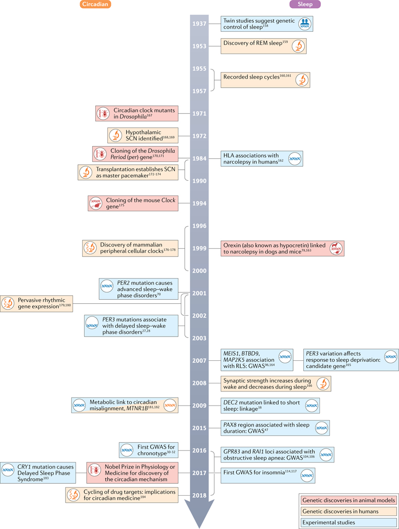 图 2 | 以遗传学为重点的昼夜节律和睡眠研究发现的时间表。