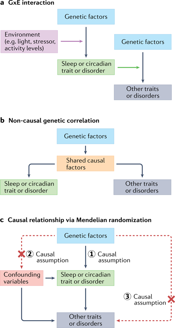 a | 基因与环境 (GxE) 睡眠和昼夜节律特征和疾病的相互作用,其中睡眠和昼夜节律既可以作为疾病的结果,也可以作为疾病的环境调节因素。b |与部分a类似,具有共同的因果因素(多效性)。当遗传因素与两种结果独立相关时,睡眠/昼夜节律特征或疾病与其他特征或疾病之间可能存在非因果关系。c |图形表示睡眠/昼夜节律特征和疾病之间的因果遗传关系,以及孟德尔随机化分析查询的下游特征/疾病。对于使用孟德尔随机化的因果关系检验,必须满足三个突出的因果假设:(1)遗传因素(例如,相关的 SNP)与睡眠/昼夜节律特征/疾病(“暴露”)强烈且明确相关;(2)遗传因素与任何混杂因素无关;(3)遗传因素应仅通过睡眠/昼夜节律特征/疾病与结果相关联。黑色箭头表示因果关系,红色虚线表示可能违反孟德尔随机化假设。