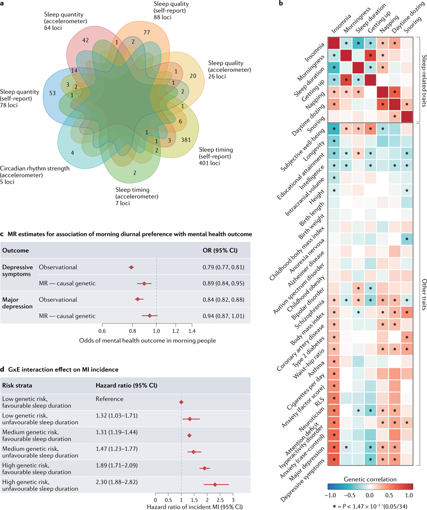 a | 在一般人群中,已识别出的昼夜节律和睡眠表型的基因位点数量显示出领域特异性重叠,主要用于睡眠时间的测量(总结自正文中讨论的已发表的全基因组关联研究(GWAS)。b |睡眠/昼夜节律特征/疾病与神经精神和代谢特征之间的遗传联系的证据,显示了失眠症状 GWAS 与睡眠、神经精神和代谢特征GWAS之间的遗传相关性热图。正遗传相关性以红色显示,负遗传相关性以蓝色显示。显着相关性以星号116表示。c |利用 GWAS 结果探究昼夜偏好(时间类型)与重度抑郁之间的因果关系,使用孟德尔随机化(MR)证明较早的昼夜偏好与较低的抑郁症状几率之间存在保护性关联134。d |睡眠时间与心肌梗死 (MI) 的遗传风险相互作用,从而影响心肌梗死发病风险187。条形图代表 95% 置信区间 (CI)。GxE,基因与环境相互作用;OR,比值比;RLS,不安腿综合征。